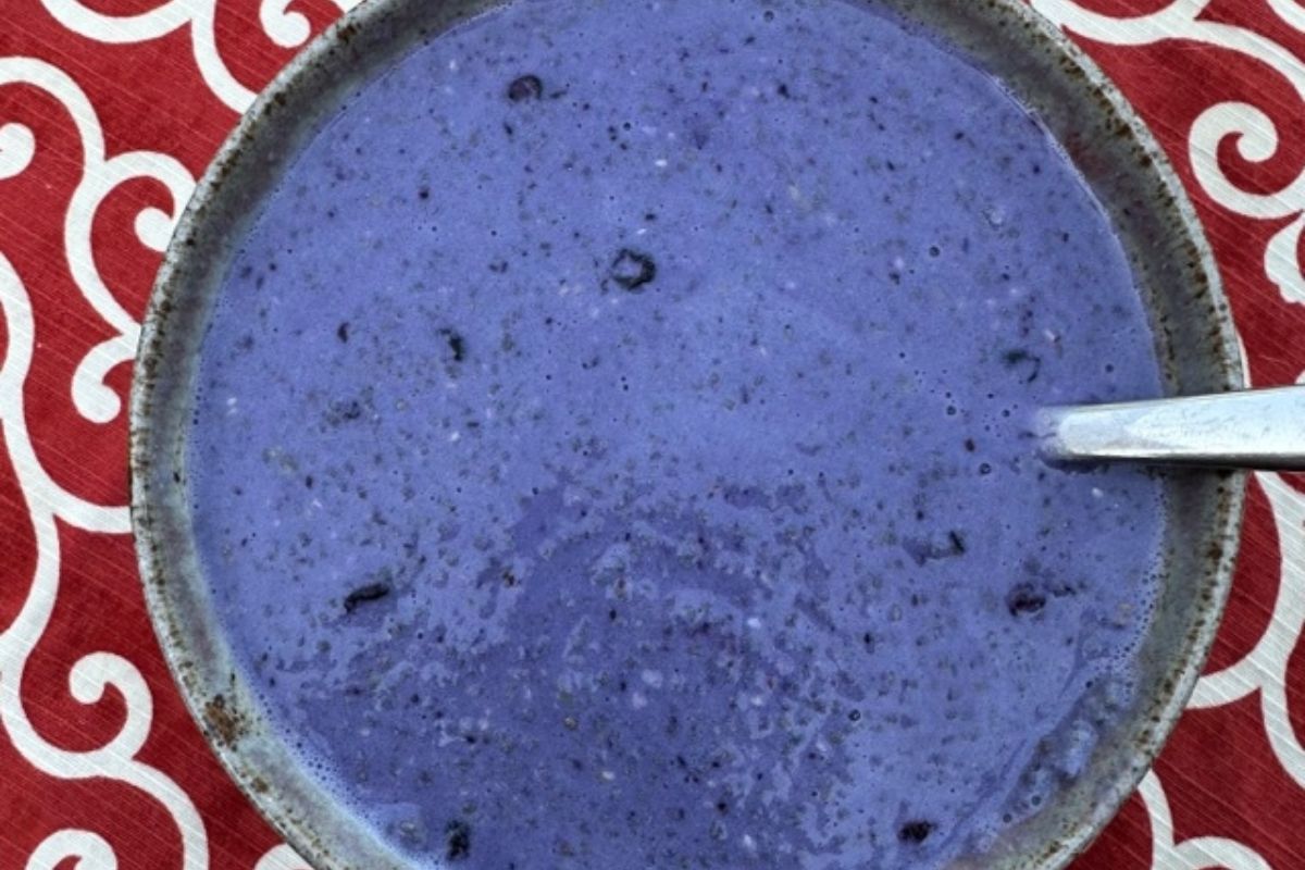 Verwarm de plantaardige melk en doe hier de (bevroren) blauwe bessen bij. De melk krijgt een mooie paarse kleur.